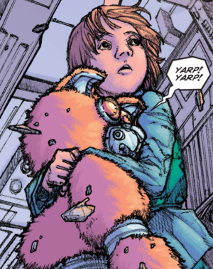 Along with Lieutenant Boomer, Ensign Athena, and other Galactica personnel, Boxey and Muffit are trapped in the rejuvenation center while the battlestar is ablaze, thanks to kamikaze Raiders packed with solonite. His pet, fortunately, saves not only them but also a downed firefighter (TOS: "Fire in Space").