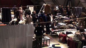 "Camp Oil Slick", later referred to as "Dogsville," is a nickname given to the lodging set up on a part of Galactica's unused starboard hangar deck for displaced civilians rescued from New Caprica during the Second Exodus. These civilians originally hailed from ships in the Fleet that were dismantled for resources during New Caprica's colonization, or are currently unable to shelter them, or are otherwise unusable.
