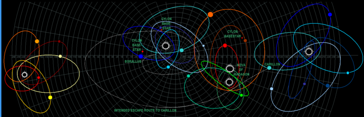 Cylon fighter groups of Cylon Raiders hide near the Cimtar moon in wait for their chance at attacking the battlestar fleet. The basestars are left free for bombardment of the Colonies.