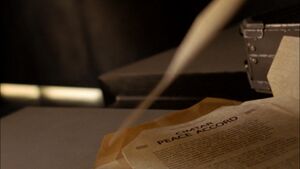 A curious continuity gap exists on the Re-imagined peace accord documents. Visible in the same scene is a technical specifications document on the original Cylon models used by the Colonies. The document contains the Original Series-specific term "yahrens". Given that the Re-imagined Series uses the standard real-world measurement terminology of "years," this is likely a goof of the props department or a homage to the Original Series than an attempt to suggest a more direct connection between the two series.