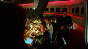 edit sourceThe FTL Station is in the area behind the Tactical Station. It is not routinely manned, but can be manned by up to two crewmembers. All functions of the FTL drive and computer can be controlled from this station. While the engineering portions of the FTL drive are usually controlled and monitored by the engineering staff, this station is sometimes staffed when more complex jumps must be made. This station is where the Tactical Officer plots and executes the jump. Sometimes the Tactical Officer inputs the jump coordinates himself, while at other times the station is manned by two seated crewmembers. However, the jump is always executed by the Tactical Officer himself. The FTL drive is engaged by inserting a blue "key" into a receptacle at the center of the console and turning it. This console folds down into a table when it is not being used.
