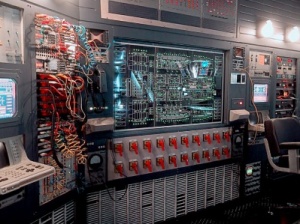 The innovative DRADIS console system became a defining feature of the design. "I then came up with the idea of placing a moveable array of screens that come down from above at the center of the room. The screens function a bit like a periscope on a ship. A lot of people weren't sure that idea would work when I initially suggested it, but the periscope concept just worked like a charm. Once people saw it, they loved it. And it's given us a lot to play with."[production 3]