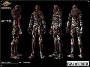- The concept for the Crimson Elite Cylons drew inspiration from the Cylon Command Centurion Vulpa, seen in "The Gun on Ice Planet Zero, Part I".