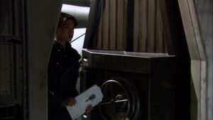 Sharon "Boomer" Valerii's Cylon personality plunders G-4 and detonators from this locker. After being boarded by Centurions during the Battle of Kobol, James "Jammer" Lyman is found by Lee "Apollo" Adama to be hiding here during a supply run for explosive rounds. |