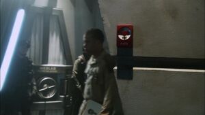 Fire alarm panels are placed for easy access in the event of a fire aboard ship. Gaius Baltar uses one such panel to temporarily evacuate the medlab in his attempt to erase manufactured evidence (TRS: "Six Degrees of Separation").