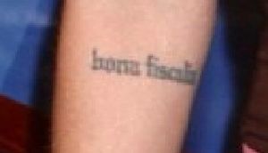 Her third tattoo is on the inner side of her right forearm, just below the elbow. It consists of the words "bona fiscalia," which is Latin for "public property". According to Sackhoff, it is a reminder to herself that, by choosing to be an actress, she has chosen to be in the public spotlight and will be regarded as a role model whether she likes it or not.[4] This tattoo is visible in numerous episodes. At the beginning of the show, they tried to avoid showing it, for example by having her tuck her arm slightly behind her back in wide-shot. However, it is still visible on many occasions and, over time, they gave up trying to hide it.