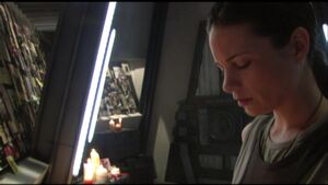 Following Gaius Baltar's public revelation regarding the blood on the dog tags recovered from Thrace's dead body on Earth, the seemingly resurrected Thrace replaces her photo back on the wall, as it was briefly removed following her reappearance (TRS: "Islanded in a Stream of Stars").