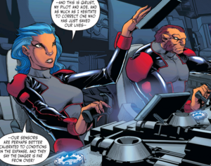 In the intervening millennia, the Okaati became a scourge that outpace and outwit the Comitat, striving to find sources outside of the Expanse. This search, lead by their leader Parrin sometime in or about 7349, results in contact with the Cylon Empire's emissaries Baltar and Lucifer. Upon their return into the Expanse, Parrin and her Cylon escort are detected by Blue Squadron following its fracas with the Kiernu. Believing the Raider escort to be attackers to the then-unidentified vessel, Captain Apollo and fellow Warriors dispatch the escort, handle an enemy with presumed similarities to the Cylons, and are introduced to another fugitive fleet ((Comics: Battlestar Galactica Classic #0) & (Comics: Battlestar Galactica Classic #3)).