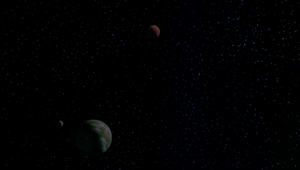 edit- ↑ The same image was also reused (now as planet Equellus) in "The Lost Warrior" as well as in "Saga of a Star World" where the large planet in the middle apparently was a devastated Colonial homeworld.