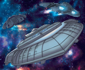 editAs the ship returns from a meeting with Baltar aboard his basestar, it is escorted by a Cylon Raider phalanx following the Fleet's entrance into the Empyrean Expanse and brief trespass through Kiernu-controlled space. Upon Blue Squadron's return from running defense against Kiernu forces, they happen upon the ship as it is returning to its fleet. Captain Apollo erroneously believes that the ship is being attacked by the Cylons and they quickly dispatch the escort, until they themselves come under attack by the Comitat (whom the Cylons are defending Parrin against), and the ship escorts the misdirected Colonial force to their own fugitive fleet ((Comics: Battlestar Galactica Classic #0), (Comics: Battlestar Galactica Classic #3)).