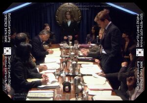 Meeting on Colonial One with the press in attendance, now-Vice President Zarek appears to act as chairman to an unruly Quorum (TRS: "The Ties That Bind").