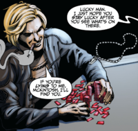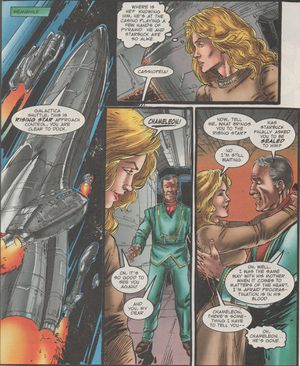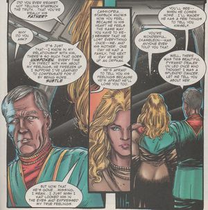 Starbuck meets his father, Chameleon, while gambling aboard Rising Star. Starbuck ends up saving his father from the Borellian Nomen that are pursuing him. Chameleon asks Cassiopeia not to reveal the results of the tests confirming him as Starbuck's father, allowing Starbuck to believe that he is not his father (TOS: "The Man with Nine Lives").
