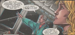 editThe lieutenant helps to inspect the ships in the Fleet, and process all of the civilians. Aboard the freighter Gemini Starbuck helps rescue Cassiopeia.