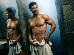 The Towel of Temptation is first beheld by civilians D'anna Biers and Bell, after they follow Louanne Katraine and Brendan Costanza to the senior pilot's quarters aboard Galactica. There, they see pilots, including Lee Adama, drying off after showers. (Flight suits are part of the Colonial Fleet's de facto water weight loss program, thus necessitating numerous showers, assuming sufficient water supplies are available.) As Adama runs cover for his pilots, the CAG finds that his cover itself slips, to D'anna's delight (TRS: "Final Cut").