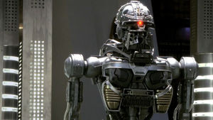 Pierre Drolet and Gary Hutzel reviewing the practical, full-size U-87 stand-in circa 2009 CE.The U-87 was designed in the real world by Battlestar Galactica and Caprica illustrator Richard Livingston[design 1] and rendered as a computer-generated character by Pierre Drolet and Gary Hutzel's effects team. The producers noted that the visual effects for the U-87 were a significant challenge, particularly for the final scene of the pilot, and that the technology to make a CGI character so central to a dramatic moment had only recently become advanced enough to be effective.[production 5] To aid the actors and camera crew, a special effects team member would perform the robot's movements on set, and it was noted how closely the final animation matched the on-set stand-in's performance.[production 6]