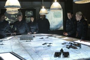 Jack Fisk and Helena Cain with Lee "Apollo" Adama and Kara "Starbuck" Thrace in the War Room planning the Battle of the Resurrection Ship (TRS: "Resurrection Ship, Part I").