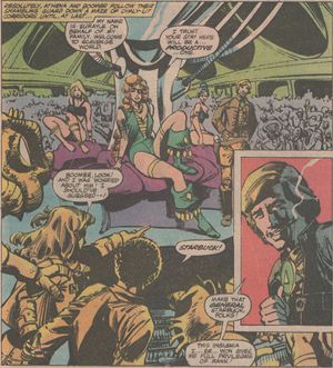 This issue begins one week after the events of issue #7, when Adama was trapped in the Memory Machine. Boomer, Athena and Starbuck, on recon patrol, stumble across Scavenge World, a planet composed entirely of spare parts and inhabited by alien scavengers. | |||