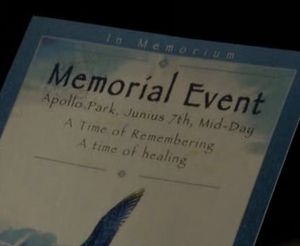 [[Image:Caprica - Memorial Invitation at Apollo Park.jpg|thumb|Memorial invitation ([[Rebirth]])]] | [[Image:Caprica - Memorial Invitation at Apollo Park.jpg|thumb|Memorial invitation ([[Rebirth]])]] | ||
