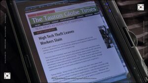 [[File:Caprica - End of Line - Tauron Globe Times - 494.jpg|thumb|An article regarding the [[meta-cognitive processor]] theft on a computer tablet {{CAP|End of Line}}.]] | [[File:Caprica - End of Line - Tauron Globe Times - 494.jpg|thumb|An article regarding the [[meta-cognitive processor]] theft on a computer tablet {{CAP|End of Line}}.]] | ||