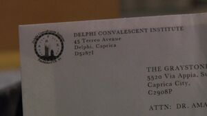 - ↑ The full address printed on the envelope received by Amanda Graystone is 45 Terreo Avenue, Delphi, Caprica, D52871.