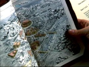 During a review of the images of the city, Laura Roslin has a vision of the city when it was still inhabited, seeing the Forum and the Opera House (Kobol's Last Gleaming, Part I), and then has quick visions of the Tomb of Athena and the Arrow of Apollo. The Forum and possibly other structures such as the Opera House and Temple are mirrored on Caprica, in Delphi.