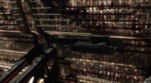 The interior matches with the Cylon basestar: Spartan metallic rooms with square, dim, light fixtures placed on the walls and ceilings. The rooms are occupied by rebirthing tanks, in which a spare body is placed, thus beginning the downloading and resurrection process (TRS: "Rapture").